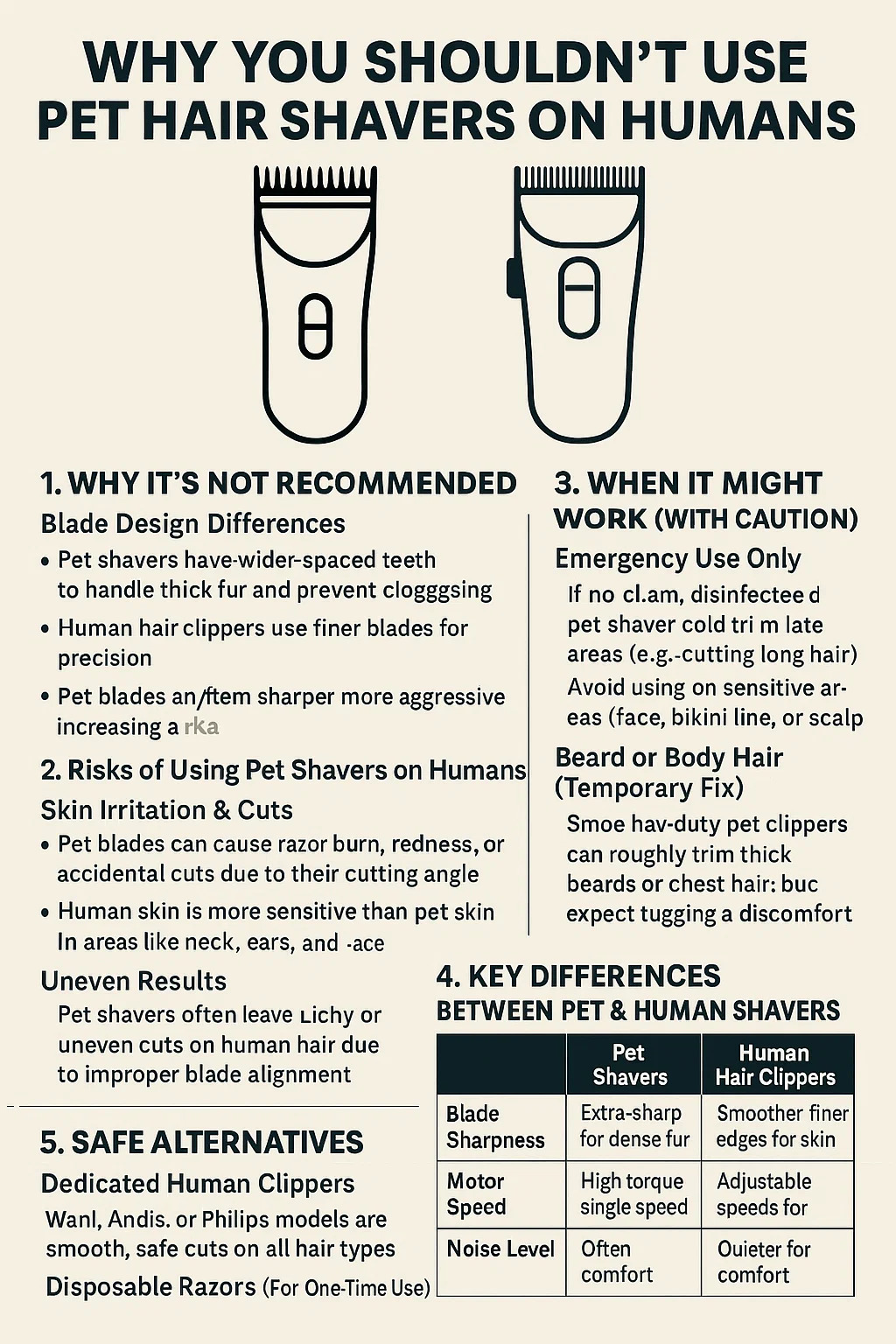 Pet Shavers hebben een bredere tanden om dikke vacht te hanteren en verstopping te voorkomen. Menselijk haar knippersen gebruiken fijnere messen voor precisie.