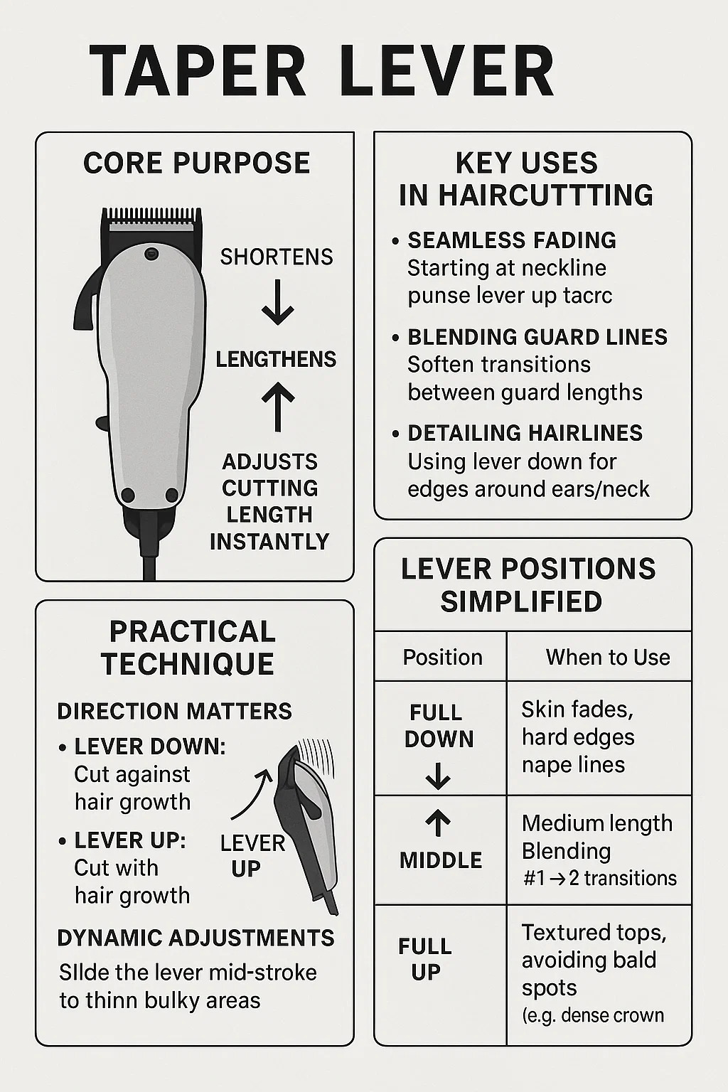 Detaillering van haarlijnen: Gebruik de hendel naar beneden voor scherpe randen rond oren/nek; hendel omhoog voor zachtere, natuurlijke afwerkingen.